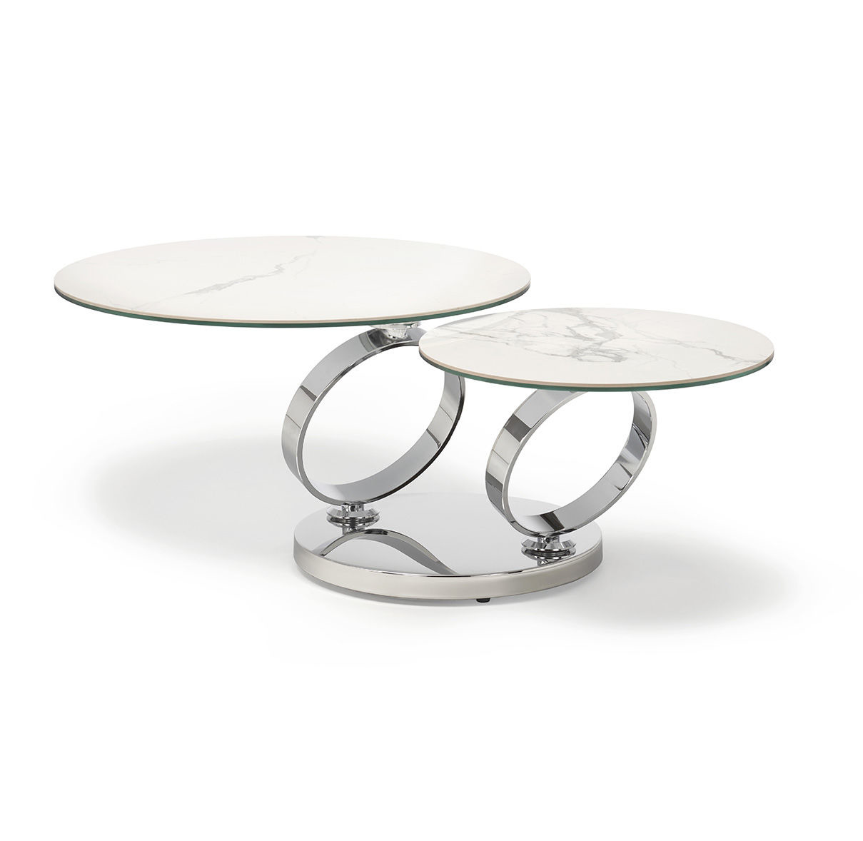The Saturn coffee table like our other movement tables is design to offer the most flexible solution. This piece with a white ceramic top allows the customer to adjust the shape and form to fit in with the friends and family in the room. The table extends from 80cm up to 135cm using a sophisticated mechanism that keeps the rings aligned.The smaller leaf is 55 cm diameter.